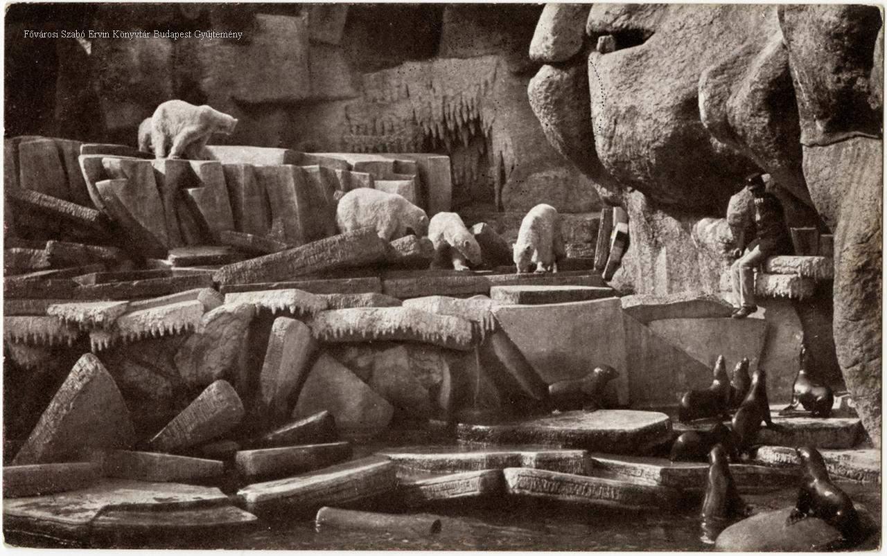 állatkert, kifutó, fóka, jegesmedve, ember, képes levelezőlap, külső felvétel, életkép, 1910-es évek