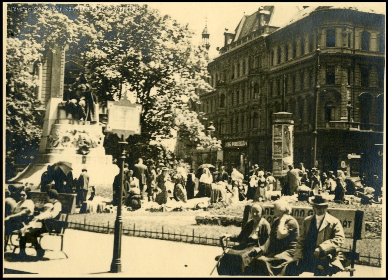 [Tinódi Lantos Sebestyén szobra a Blaha Lujza téren, előtte árusok csoportja]