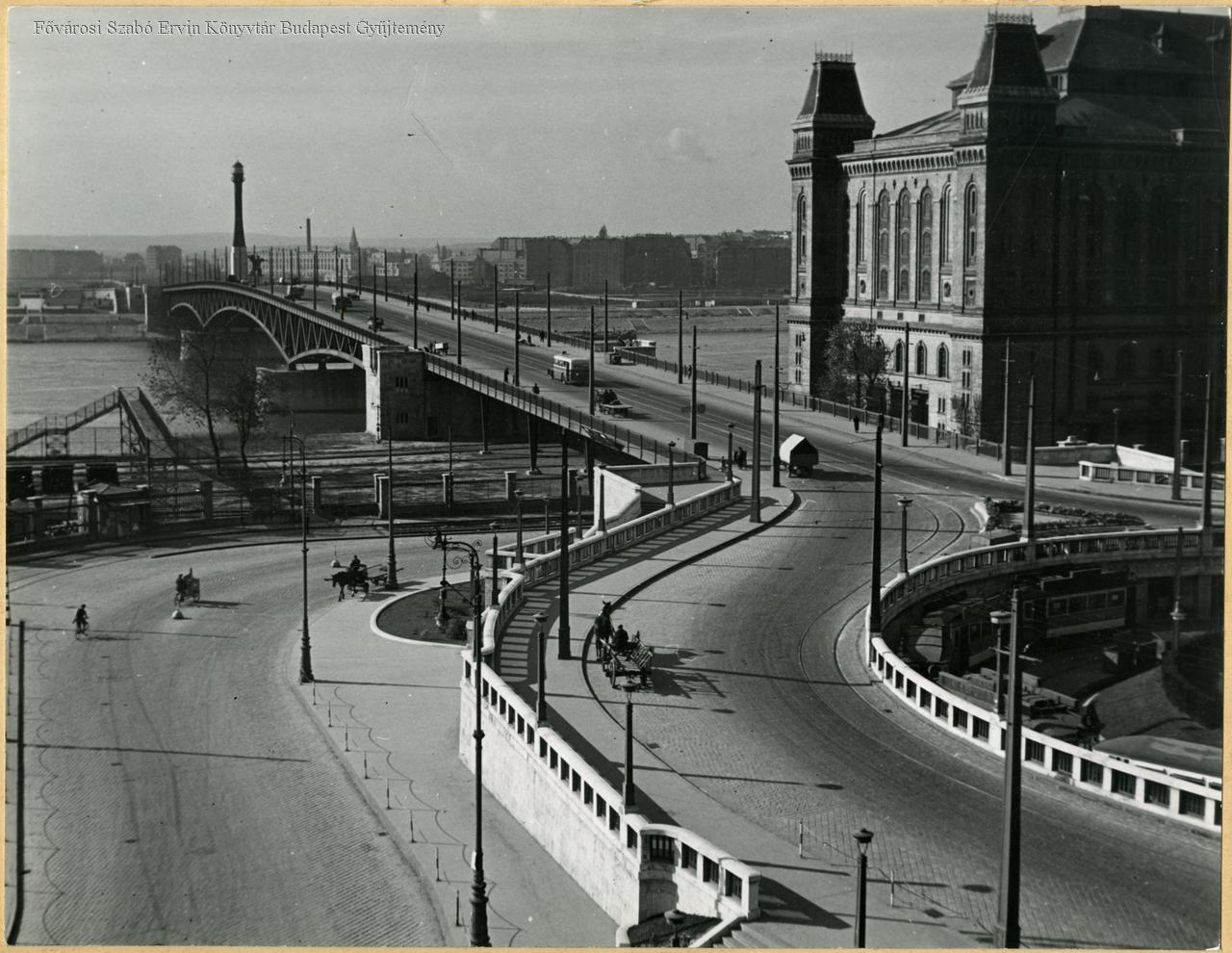 közúti híd, hídfő, villamos kocsi, villamosmegálló, lovas kocsi, raktár, 1940