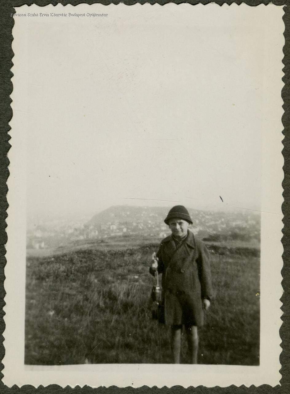 [Kiránduló fiú a Hármashatárhegyen, távolban a főváros épületei]
