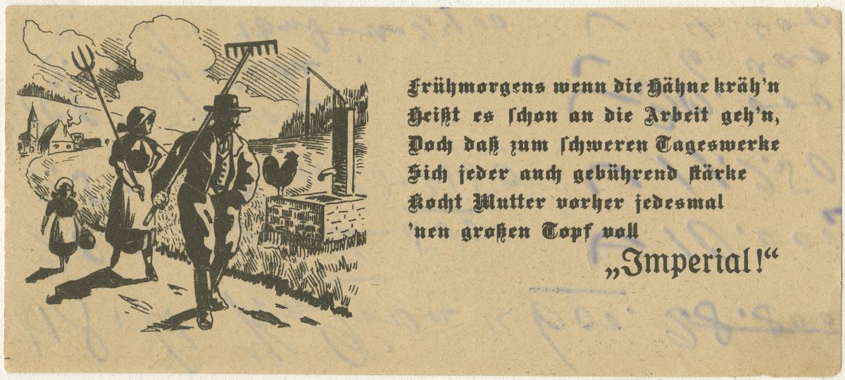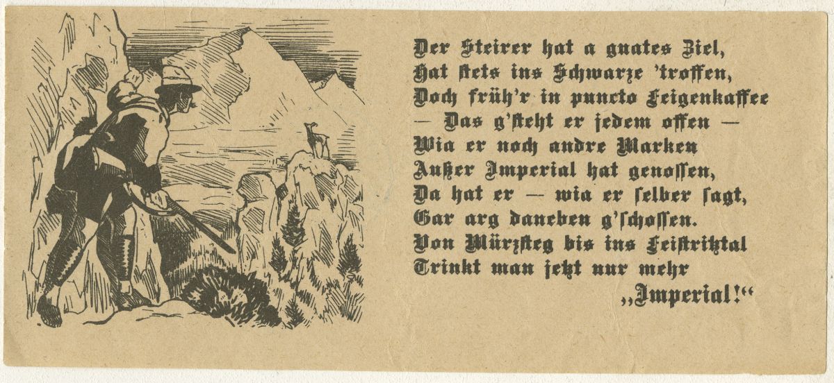 kávé, élvezeti cikk, ital, vadász, kecske, parasztok, nő, férfi, gyerek, kakas, gereblye, vasvilla, reklámnyomtatvány, kisnyomtatvány, aprónyomtatvány, számolócédula