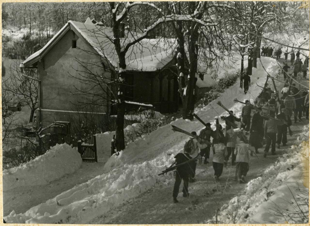 [Síelők csoportja gyalogol a hegyi pálya felé a Zugligeti úton]