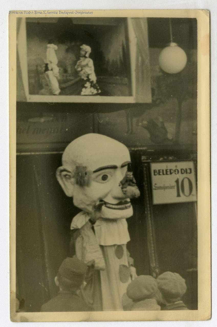 Gyerekek álldogálnak a "Művészi Bábszínház" feliratú látványosság bejárata előtti bohóc figura körül, valószínűleg a Városligetben