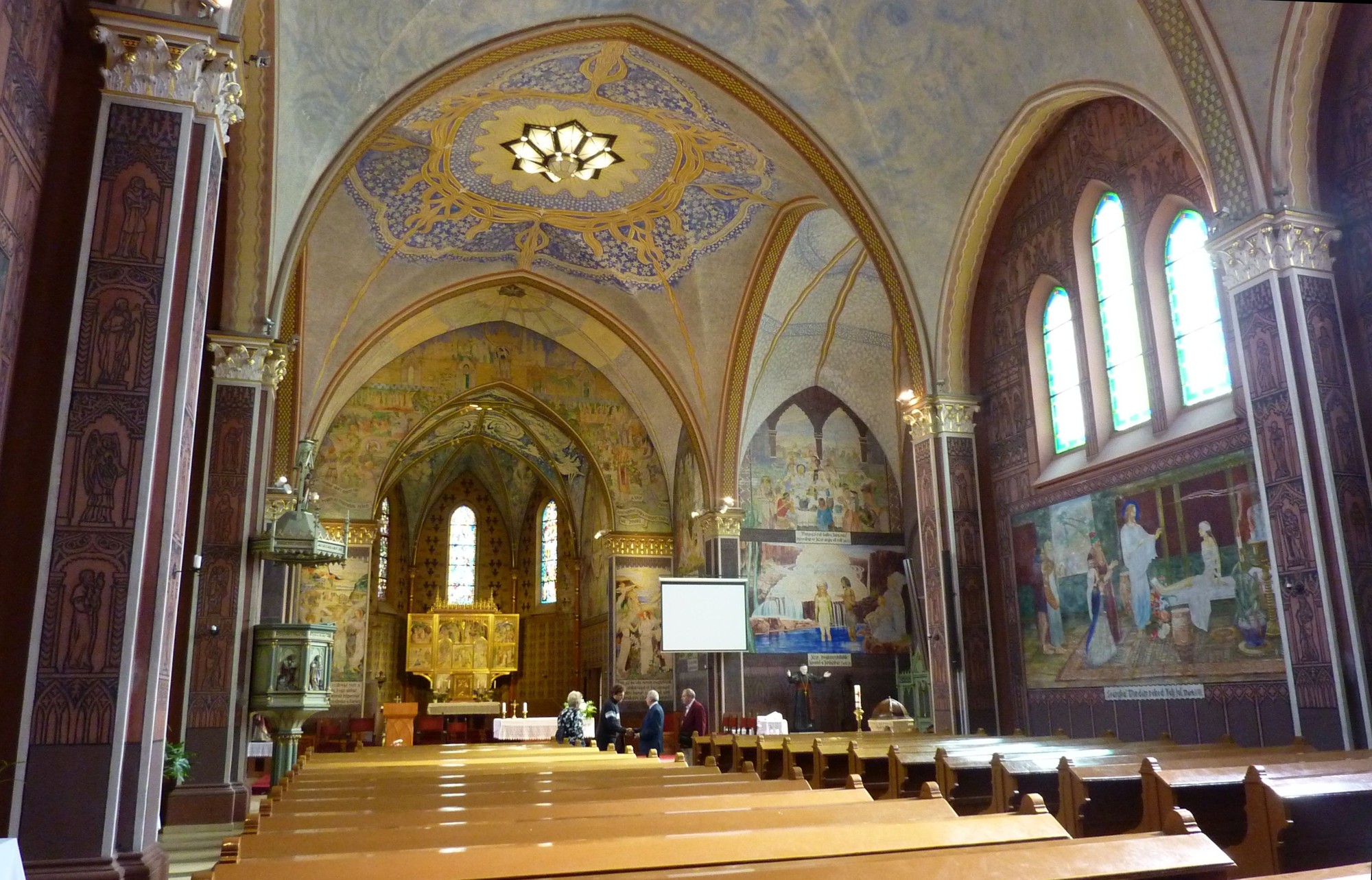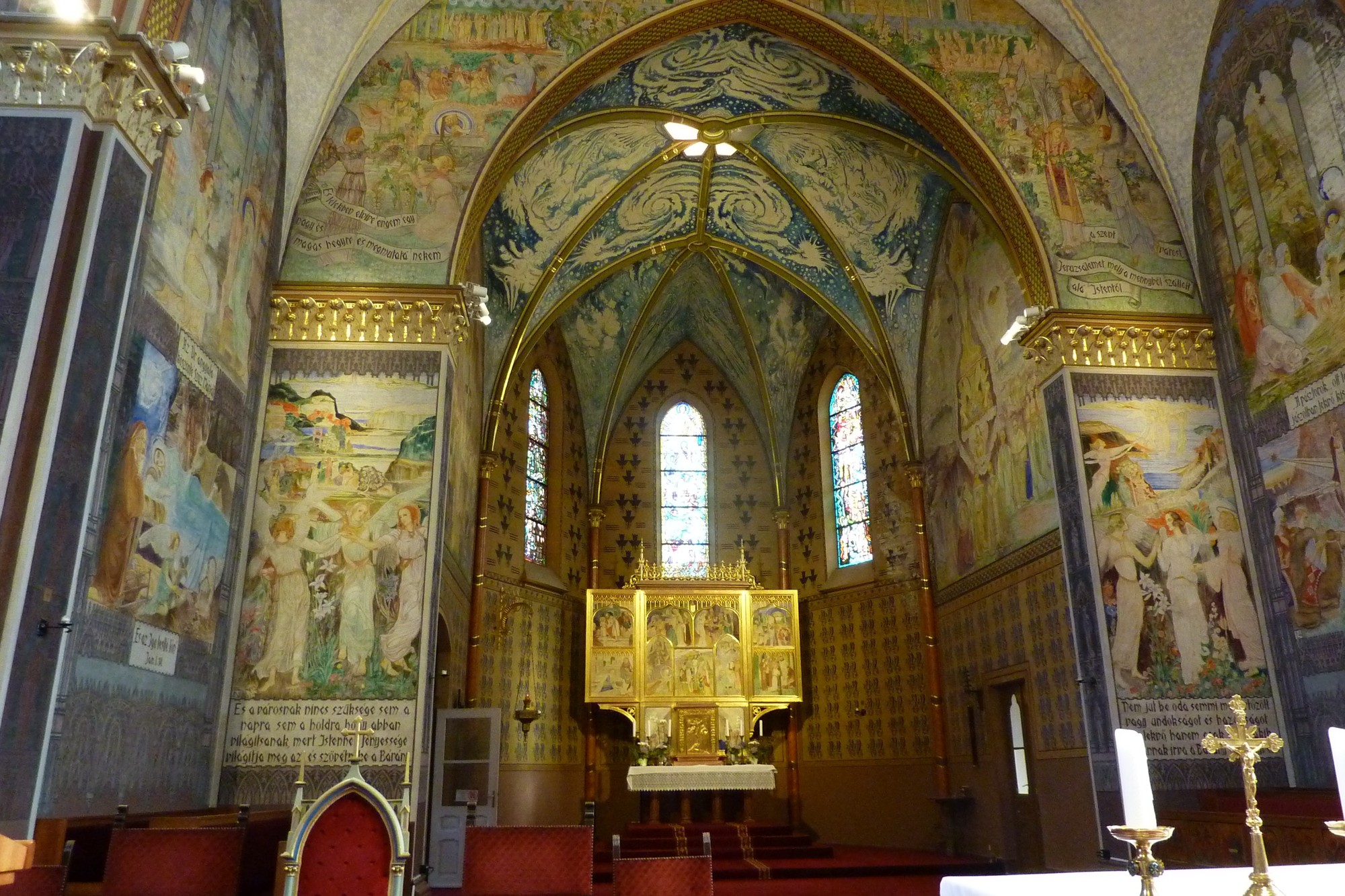 Harangjait Egry Ferenc budapesti harangöntő készítette, de ezeket 1916-ban elvitték hadi célra. 1925-re készültek el a ma is meglévők a Szlezák műhelyben: Szent Erzsébet, Borromei Szent Károly, Szent Adalbert és Szent György tiszteletére. 1927-ben világító órát kapott, ami a frankfurtihoz igazodó, rádióhullámon érkező szinkronjeleknek köszönhetően mindig pontos. A templomba a holland Johannus Orgonagyártól érkezett elektromos orgonát építettek. Neogót stílusú, egyhajós, kereszthajós építésű. Középen előreugró, 32 m magas főtornyát két kisebb veszi közre. Falazata kívül tégla és vakolt burkolat. Belsejét eredetileg Jureczna Antal festményei díszítették, majd 1937 óta a gödöllői iskola utolsó képviselőjének, Nagy Sándornak a szecessziós freskói ékesítik. A főhelyen látható szárnyas oltár Szent Erzsébet életét beszéli el (9. kép). Az üvegablakok Nagy Sándor és Gaál Imre munkái. A boltozaton a csillagos ég jelenik meg. Szobrai: Szent István, Szent László (fából), Jézus, Szent János, Szent József, Szent Antal, Szent Ferenc és Mindszenty József hercegprímás szobra. A két mellékoltár Pannonhalmi Zsuzsa és Flamm Mária keramikusok alkotásai.