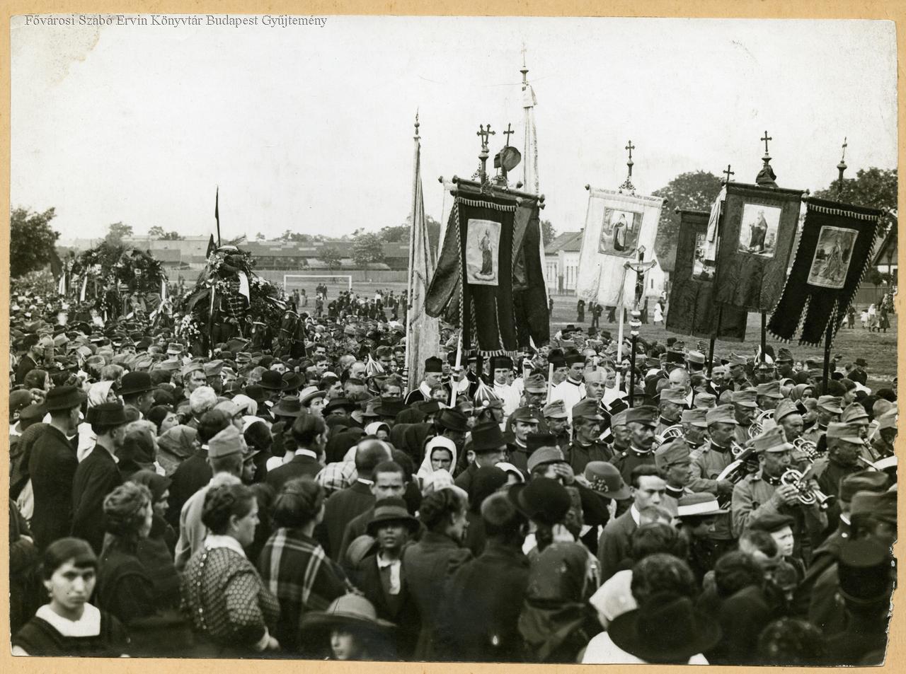 eseménykép, sajtófotó, néptömeg, gyászszertartás, temetkezés, felvonulás, koszorú, hintó, katona, németek, zászló, katonazenekar, labdarúgópálya, baleset, első világháború, 1915