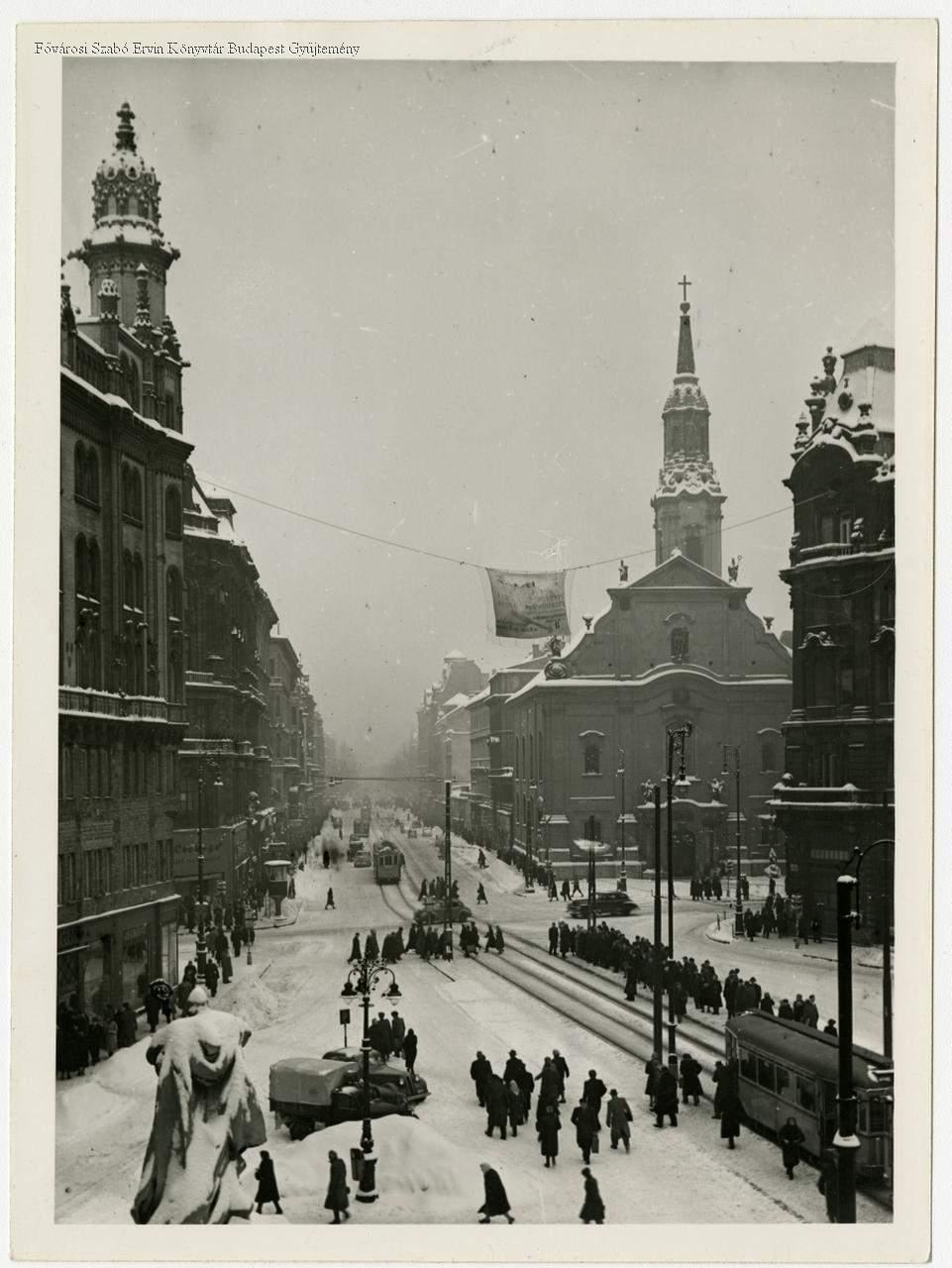 A téli Kossuth Lajos utcán és az Apponyi téren (Ferenciek tere) járókelők, az előbbin villamosok közlekednek. Jobbra elöl a Belvárosi Ferences-templom