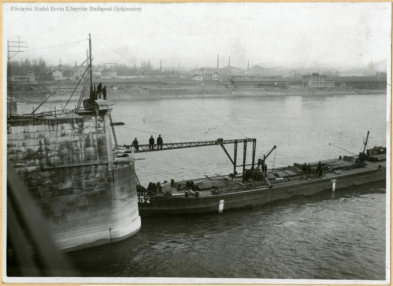 közúti híd, vezetéktartó oszlop, villamos szerelés, hídépítés, uszály, munkás, 1920-as évek