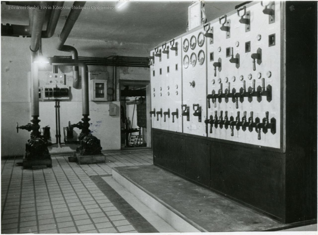 [A Rudas fürdő gépháza, kapcsolótábla, szivattyúk]