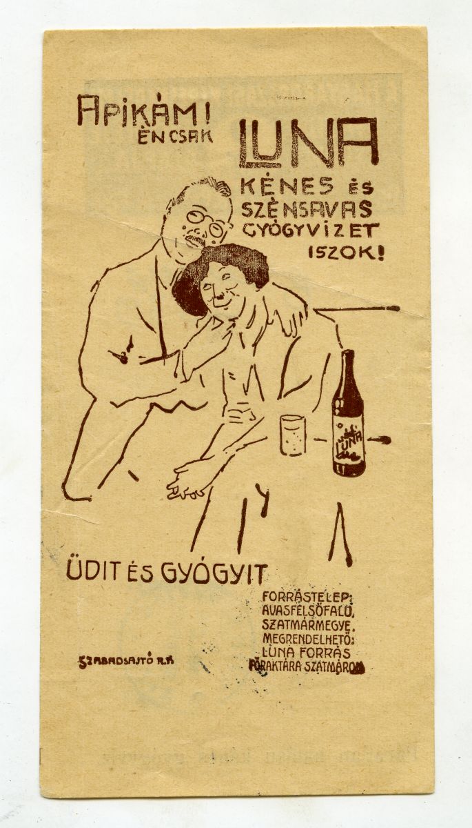 Üdít és gyógyít. Forrástelep: Avasfelsőfalu, Szatmármegye. Megrendelhető: Luna forrás főraktára Szatmáron.
