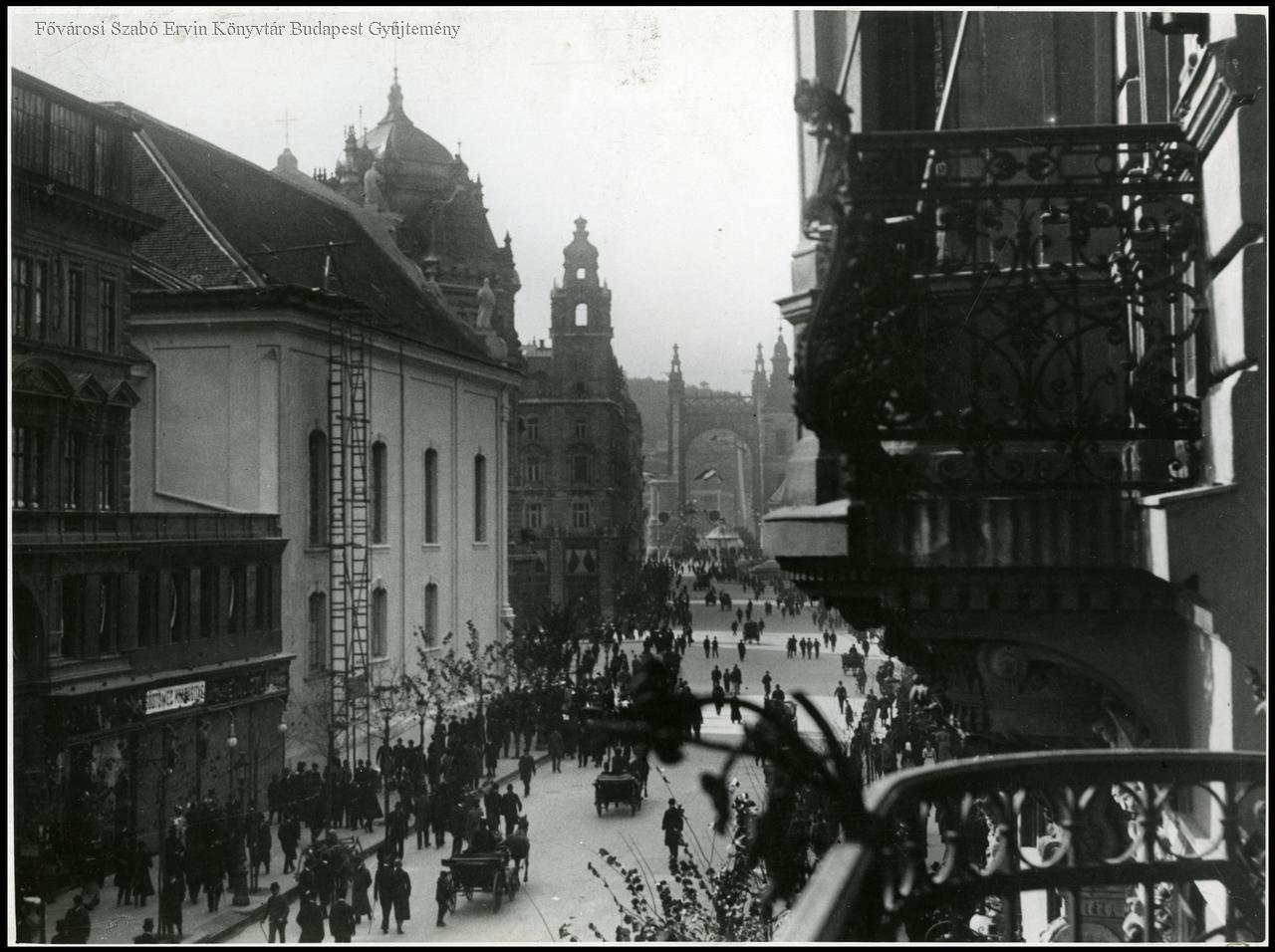 utcakép, néptömeg, lovas kocsi, erkély, híd, 1903 körül