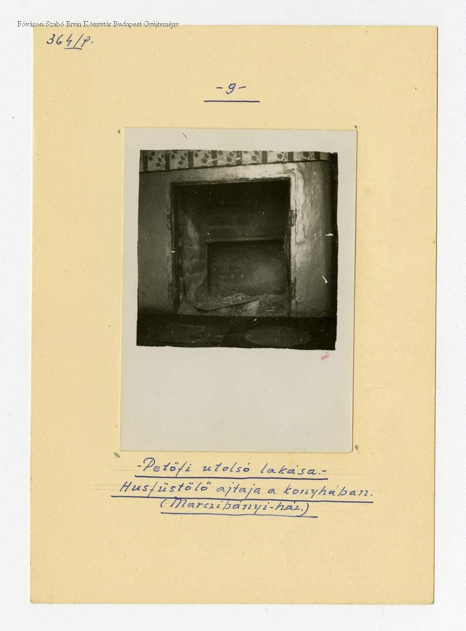 Kartonokra ragasztott, kisméretű fénykép-sorozat egyik darabja. Az amatőrfotók Petőfi utolsó pesti lakhelyét, a Rákóczi és a Síp utca sarkán egykor állott Marczibányi-házat mutattatják. 1936-ban készültek, többségük néhány héttel a ház lebontása előtt, néhány pedig a munkálatok megindulása után. Vélhetően Vasberényi Géza (1894-1981) könyvtáros, helytörténész tulajdona volt. (Esetleg ő készítette a felvételeket is?). Vasberényi Géza a húszas évektől kezdve gyűjtötte a költő emlékéhez kapcsolódó tárgyakat, dokumentumokat. Petőfi-relikviagyűjteményét haláláig dunavecsei házában őrizte, mely maga is emlékhely volt: az ifjú poéta 1844-ben ennek egyik szobájában vett kvártélyt magának. A Petőfi-kutató hagyatékát az örökösök eladták, szétszóródott. Egy részét az Ecseriről mentette meg egy magángyűjtő, 2012-ben pedig a Petőfi Irodalmi Múzeum is vásárolt néhány darabot az értékes tárgyakból.