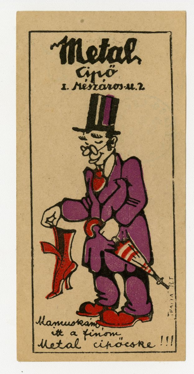 cipő, cipész, férfi, cilinder, esernyő, szemüveg, reklámnyomtatvány, kisnyomtatvány, aprónyomtatvány, számolócédula