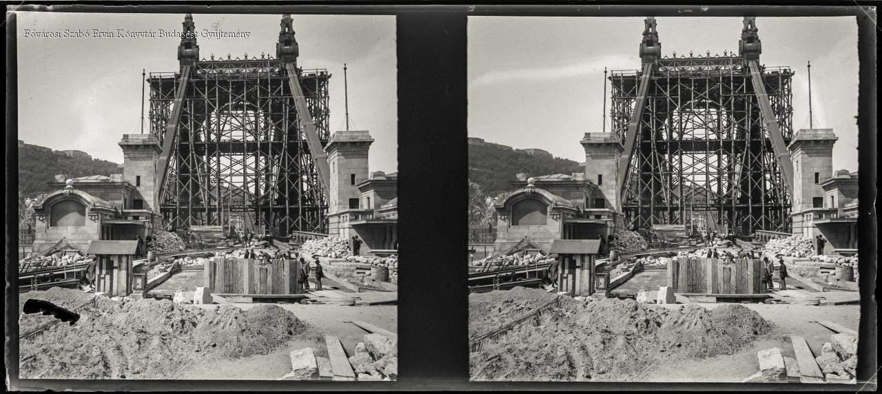 [Az Eskü téri / Erzsébet híd építése a pesti oldal felől] [Construction of the Eskü Square (Elizabeth) Bridge from the Pest side]