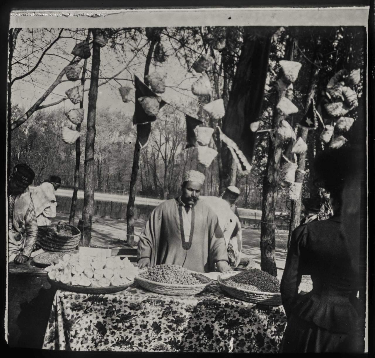 állatkert, növényzet, fa, néptömeg, közönség, ember, férfi, nő, arabok, néprajz, bemutató, szociáldarwinizmus, öltözködés, viselettörténet, piac, áru, kosár, termék, fűszer, élelmiszer