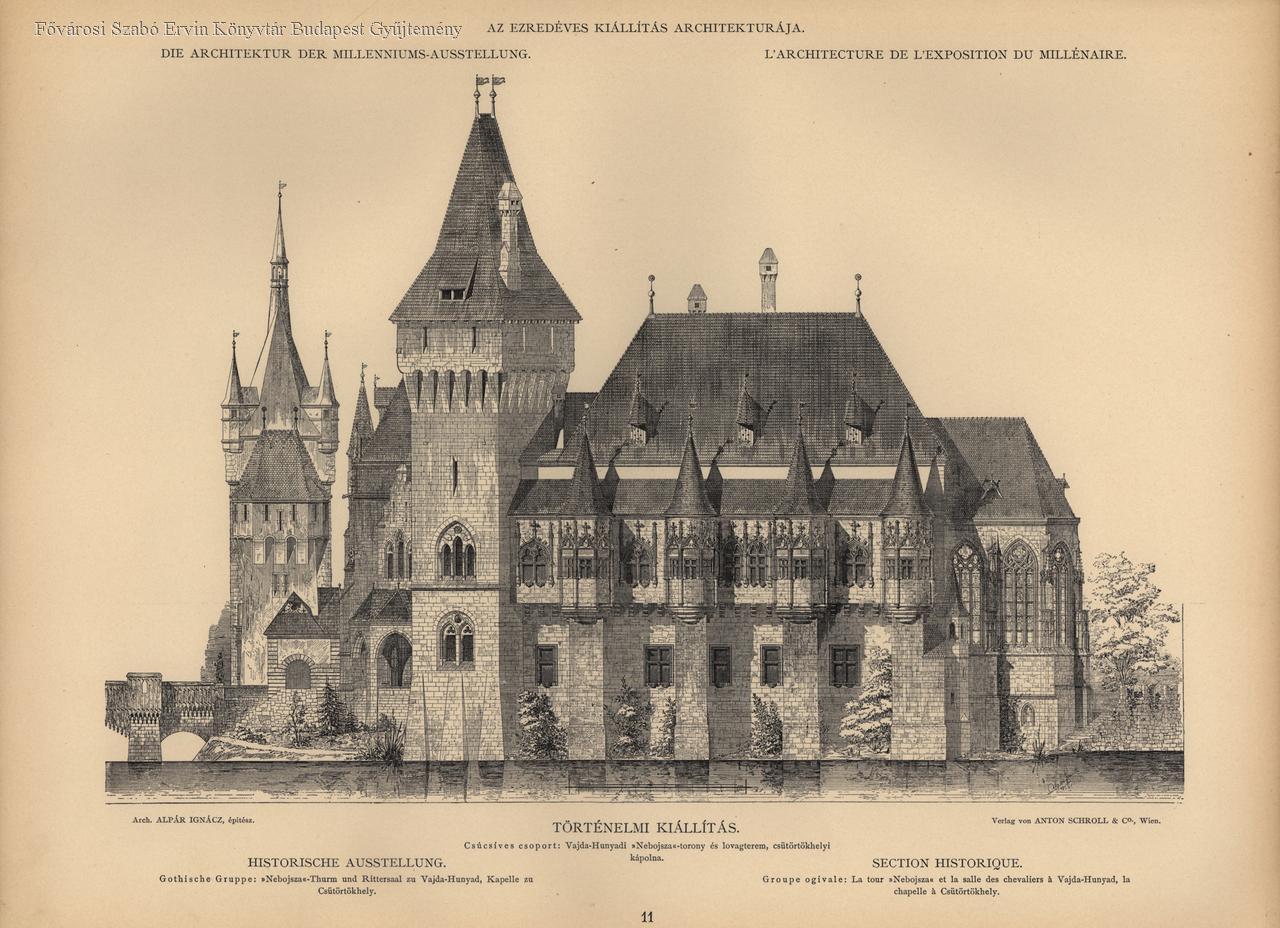 Történelmi kiállítás csúcsíves csoport: Vajda-hunyadi "Nebojsza-torony" és lovagterem, csütörtökhelyi kápolna Arch. Alpár Ignác /