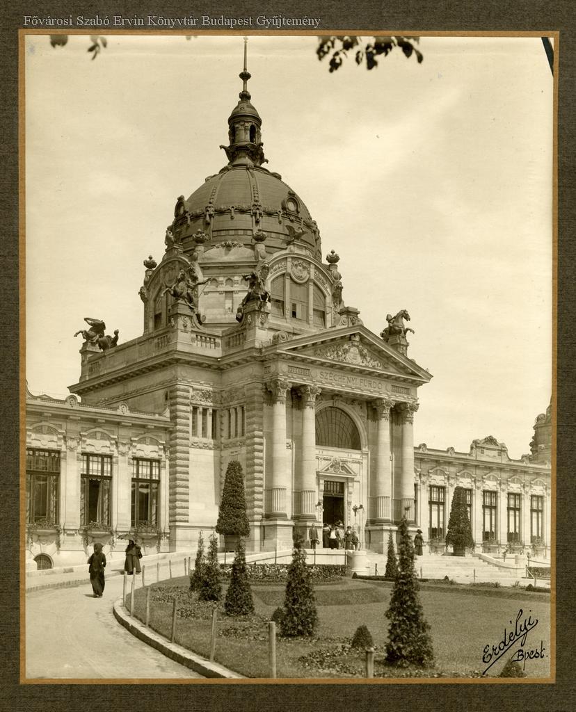 gyógyfürdő, épületkép, neoreneszánsz, park, személy, öltözködés
