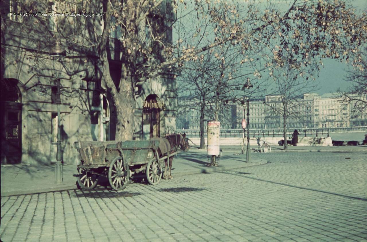 látkép, utcakép, lakóépület, lovas kocsi, ember, , lámpaoszlop, fa, hirdetőoszlop, 1937-1944