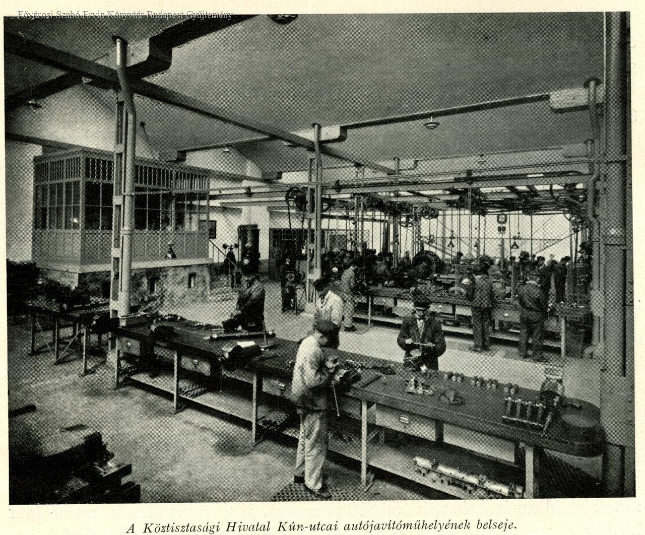 A Köztisztasági Hivatal Kun-utcai autójavító műhelyének belseje
