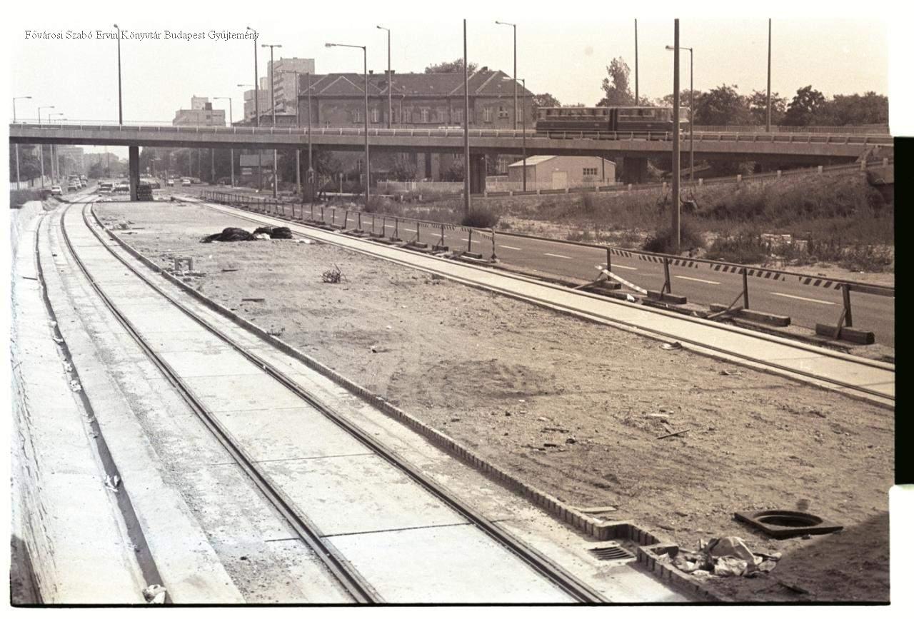 külső felvétel, látkép, épületkép, felüljáró, építés, vasúti sín, vasúti pálya, autóbusz, 1980-as évek
