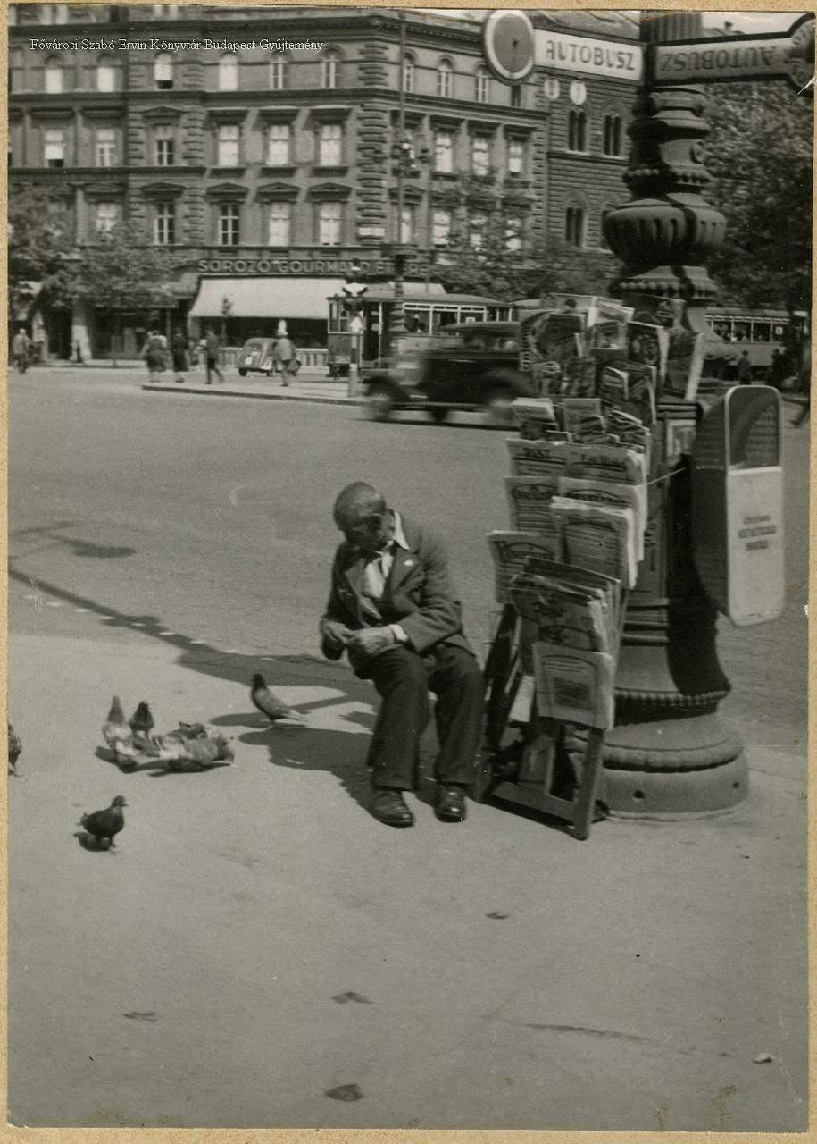 Középen galambokat etető, újságágot áruló férfi, mögötte az Oktogonon gépjárműforgalom, várakozó villamos