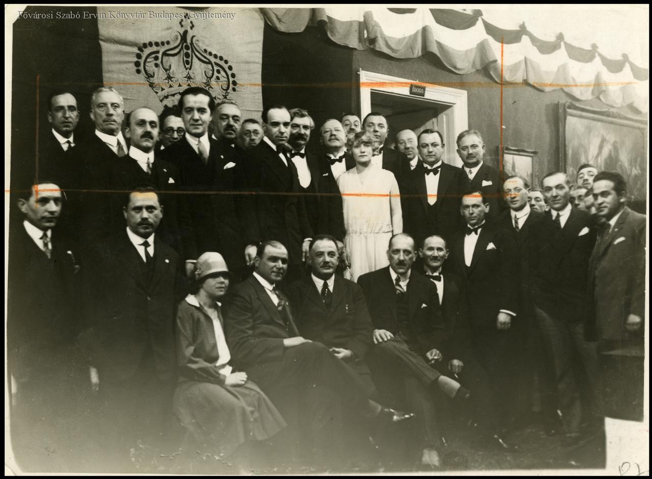 [Olasz-magyar sportbarátság a Terézvárosi Társaskör helyiségében] [Santelli Italo, Osconde di Franco, Oxilia ezredes, Fischer Mór a FIFA alelnöke, Dési Géza, Fischerné és Dinich Viktor népes társaságban]