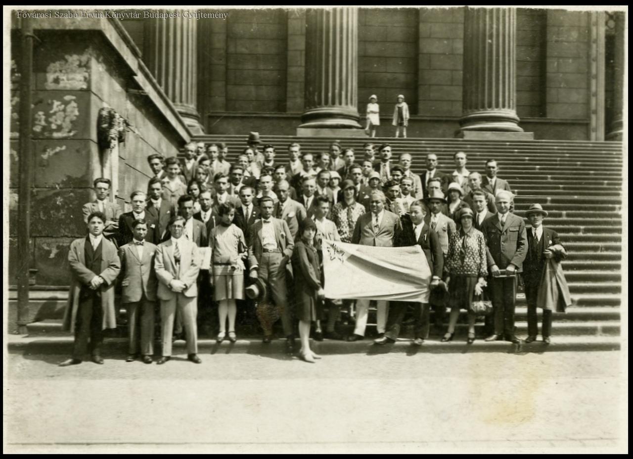 [Az első Magyarországon megrendezett eszperantó világkongresszus résztvevőinek egy csoportja a Nemzeti Múzeum lépcsőin, 1929.augusztus]