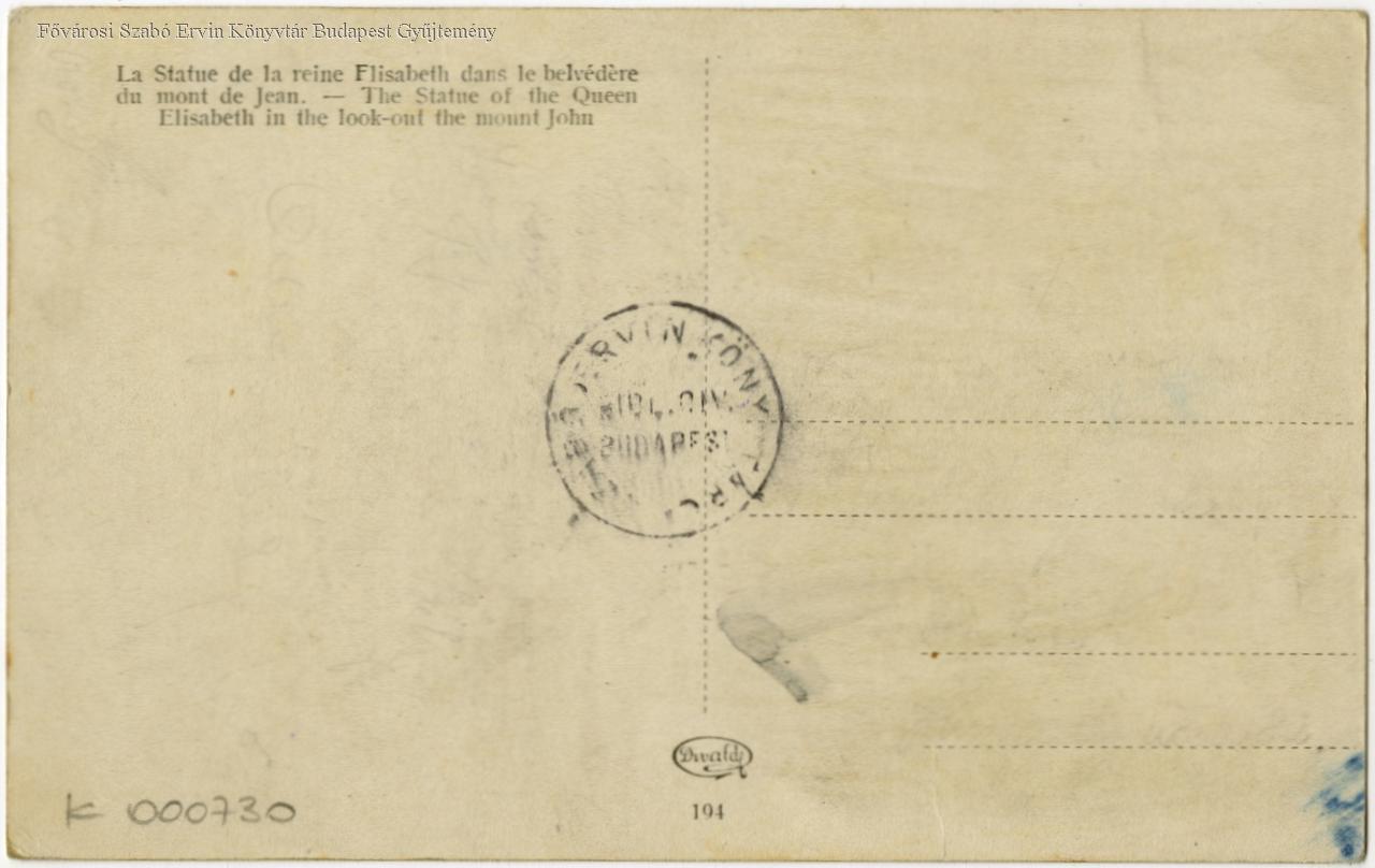 Budapest Erzsébet királyné szobra a jánoshegyi kilátótoronyban (529 m) = Denkmal der Königin Elisabeth im Aussichtsturm am Johannesberg = La Statue de la reine F[!]lisabeth dans le belvédère du mont de Jean = The Statue of the Queen Elisabeth in the look-out the mount John /