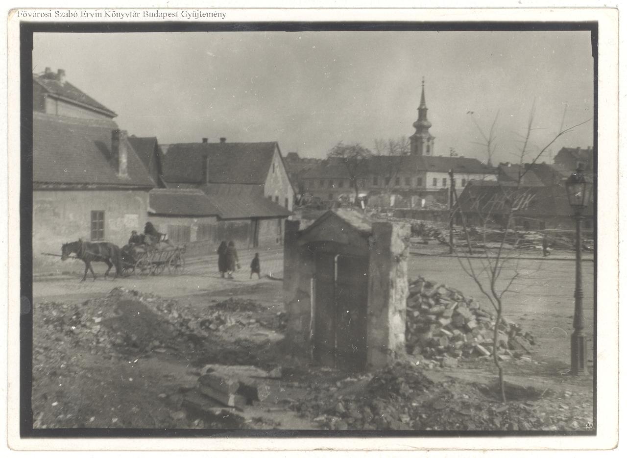 Az árván álló kapu (egykori Bocskay tér 2. sz.) körül bontási anyagok, háttérben a Szent Katalin templom tornya