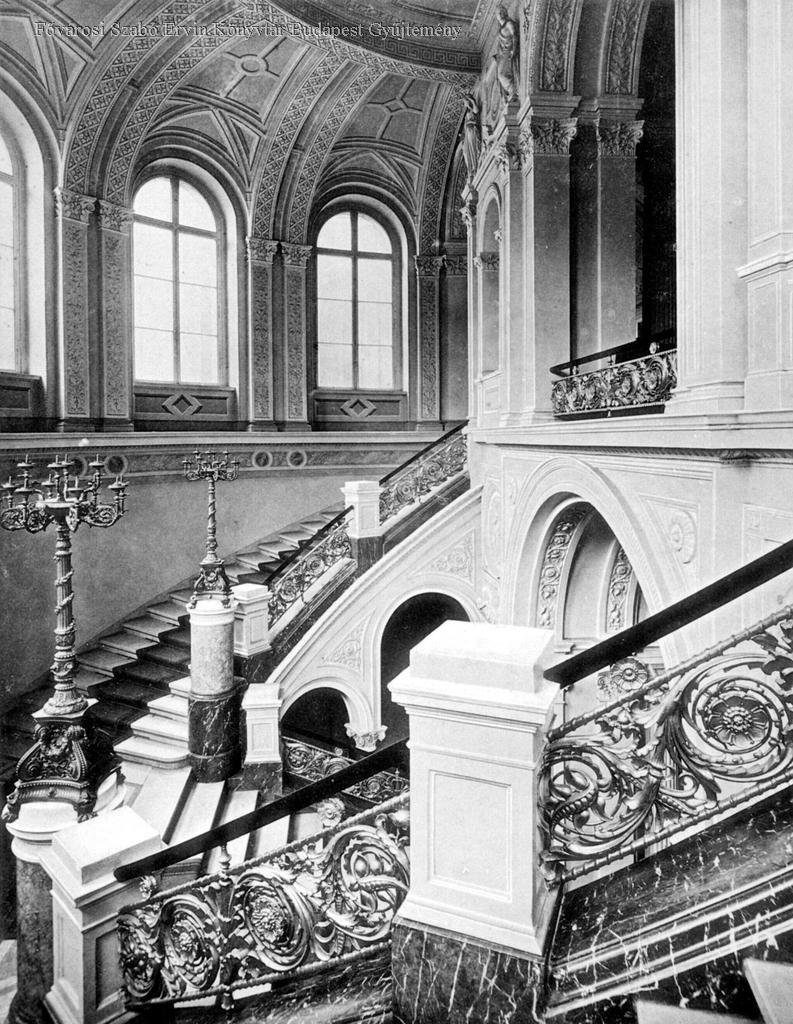 tudományos intézmény, neoreneszánsz, lépcsőház, díszítés, gyertyatartó, épületkép, belső felvétel, 1894 és 1910 között