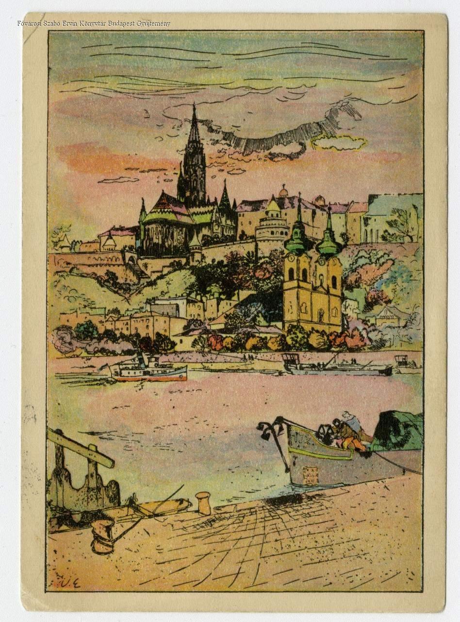 bástya, templom, katolikus egyház, rakpart, hajó, uszály, képes levelezőlap, külső felvétel, látkép, 1930-as évek