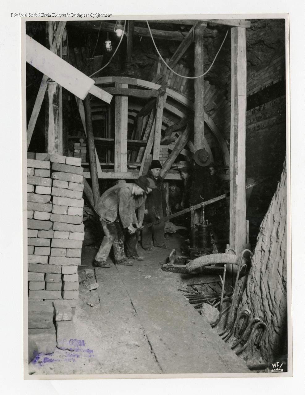 kórház, óvóhely, föld alatti létesítmény, bunker, barlang, pince, alagút, építés, munkavégzés, fizikai munka, munkavégzés különleges körülmények között, mélyépítés, alagútépítés, kőművesmunka, munkás, állvány, boltozat, tégla, szivattyú, légoltalom, polgári védelem, második világháború, 1930-as évek, 1940-es évek, 1939-1943
