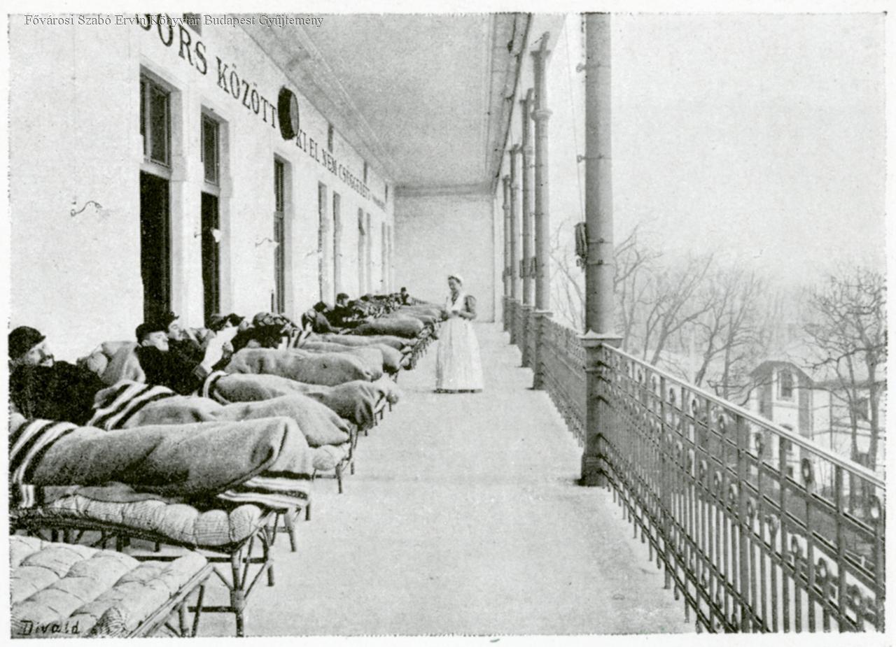 Külső felvétel. A folyosón elhelyezett ágyakon férfibetegek fekszenek, háttérben egy nővér