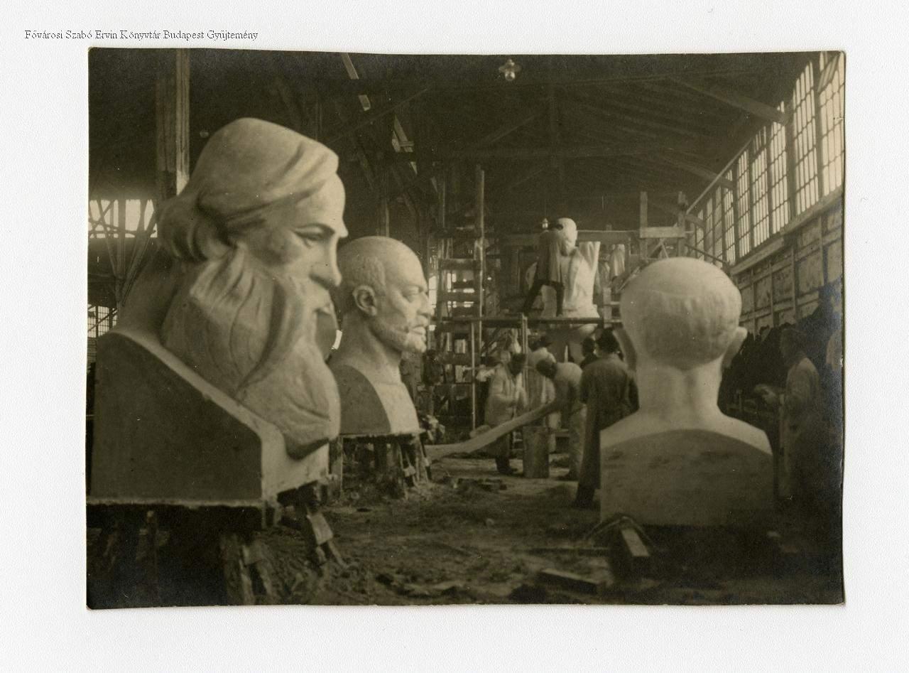 [Az 1919. május elsejei ünnepi dekorációhoz készülnek Engels és Lenin szoborportréi, háttérben az "Őszirózsás katona", Kisfaludi Strobl Zsigmond munkája készül]