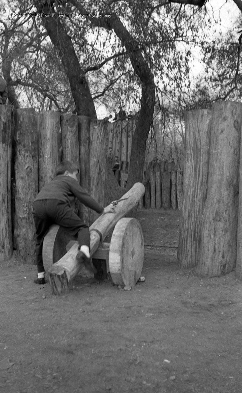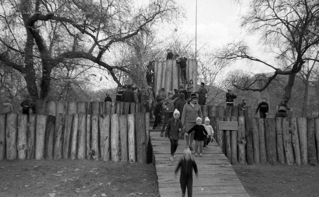 [Játszó gyerekek a Városligeti játszótéren és a rönkvárnál]