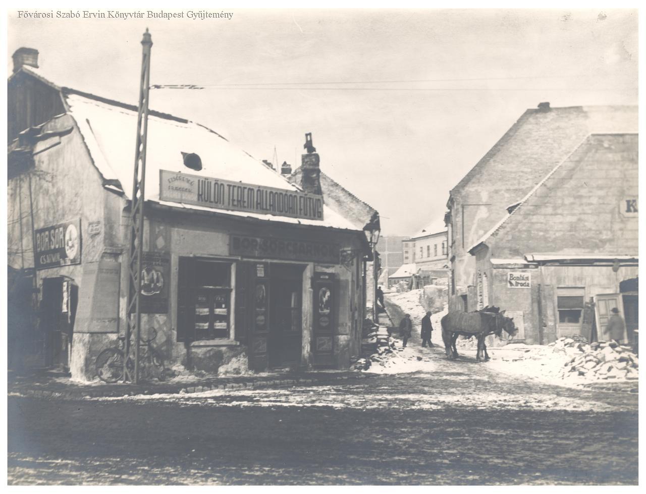 [Tabáni utcarészlet bor- és sörcsarnokkal]