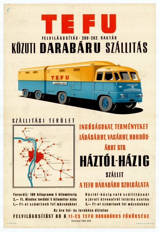 A TEFU darabáru szállítási szolgáltatását hirdető plakát, a fuvardíjjal és szállítási terület térképével feltüntetve. A szállítási területet egy Budapest térképen jelzik. Ingóságok, termények, ládásárú, vasárú, hordósárú szállítását vállalják. A vállalatot egy kék-sárga autó szimbolizálja, az oldalán TEFU felirattal. Háztól házig szállításnál, a járati útvonalról való letérés esetén mázsánként 3,-ft összeget számolnak fel. A Teherfuvarozási Nemzeti Vállalat (TEFU) 1948-ban alakult meg. 1953-ban, a magyar közúti fuvarozás jelentős átszervezése után beolvadt az Autóközlekedési Vállalatokba (AKÖV).