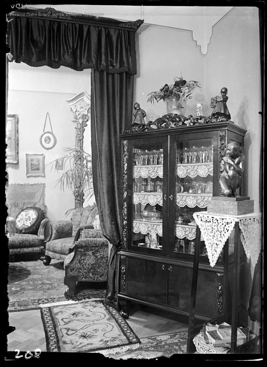 lakás, bútor, középosztály, vitrin, pohár, csipke, terítő, szőnyeg, faliszőnyeg, épületkép, belső felvétel, két világháború közötti időszak, 1933
