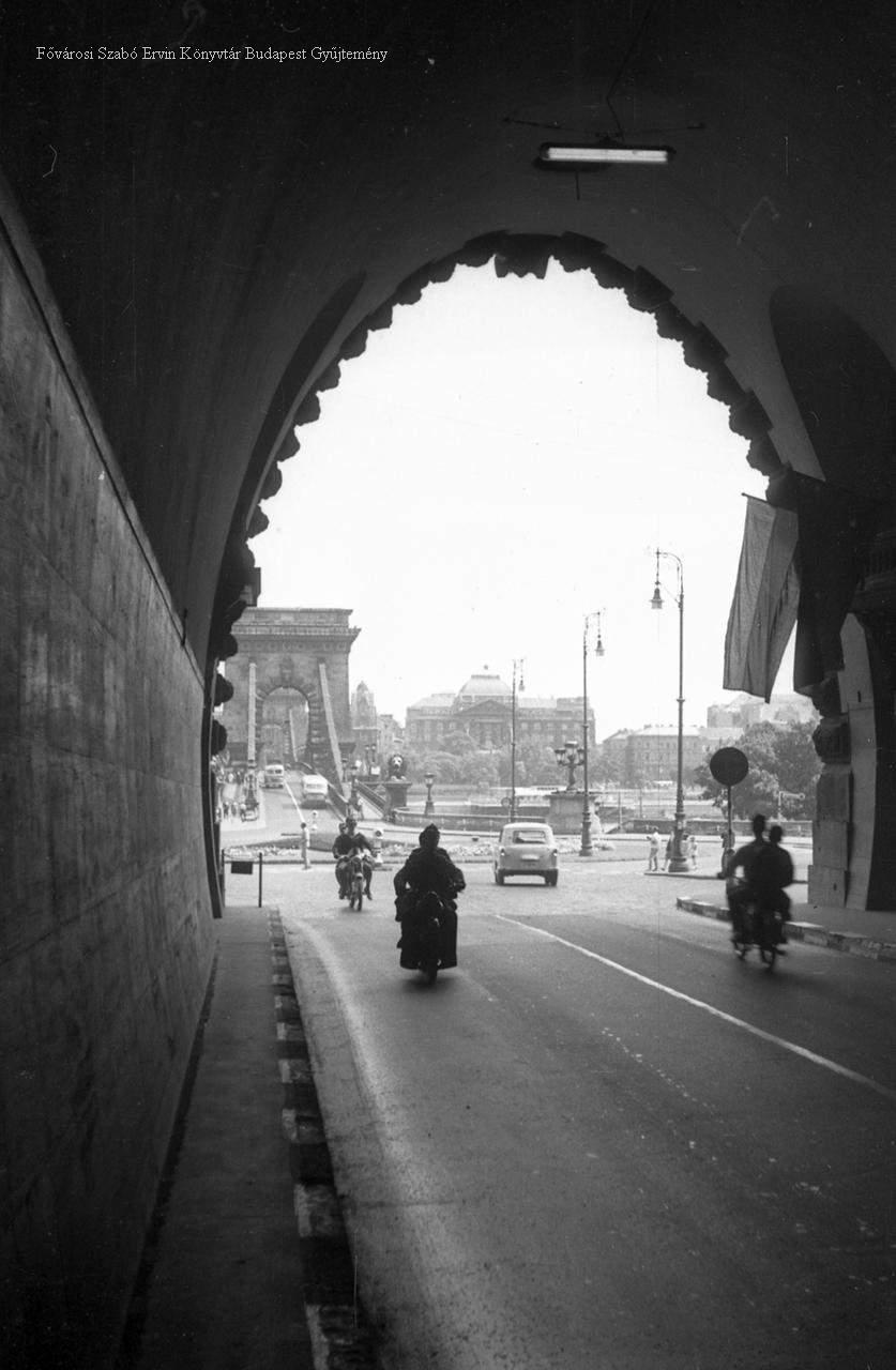 külső felvétel, látkép, híd, alagút, személygépkocsi, motorkerékpár, ember, közlekedés, 1960-as évek