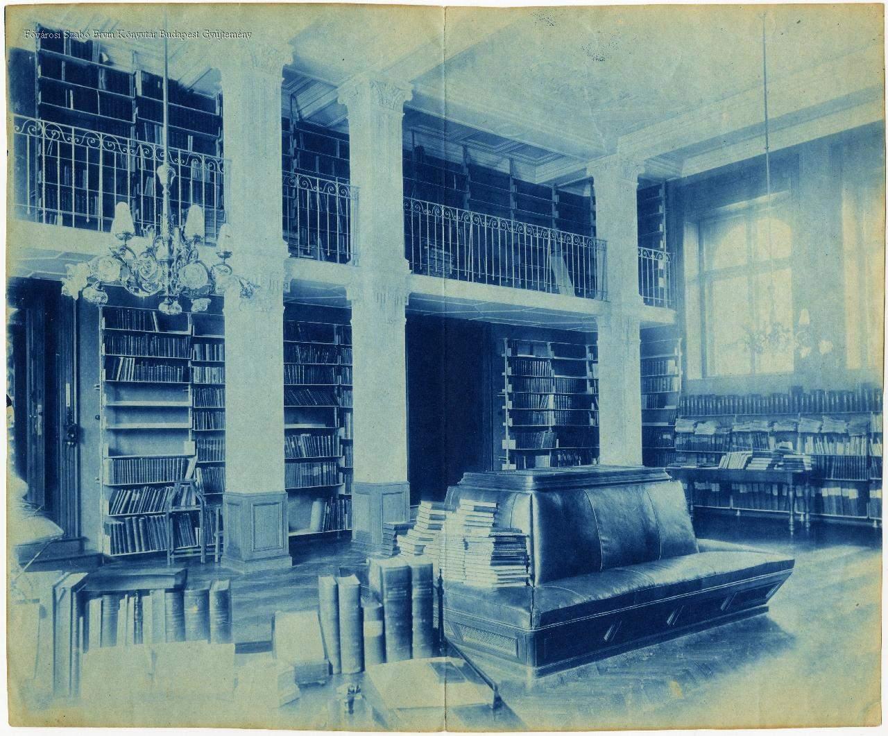 testületi könyvtár, könyv, könyvespolc, ülőbútor, asztal, lámpa, belső felvétel, századforduló, 1900 körül