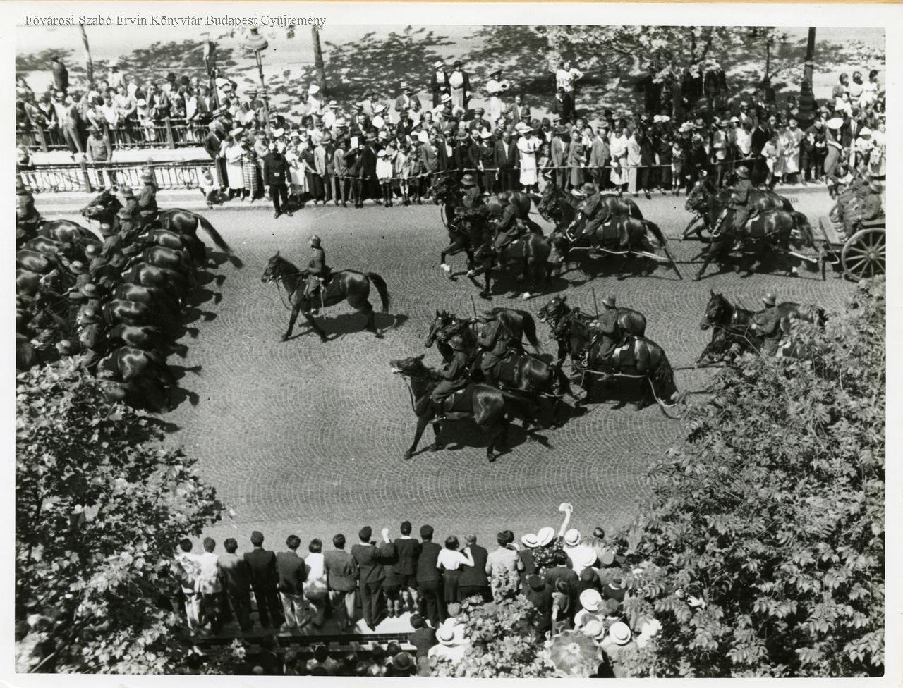 Az olasz király látogatása Budapesten: honvéd lovasság felvonulása