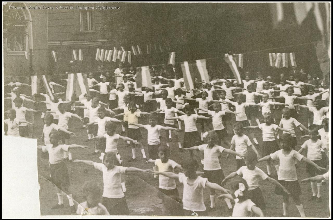 református egyház, általános iskola, egyházi iskola, udvar, külső felvétel, tornagyakorlat, általánosiskolai tanuló, fiú, lány, 1931