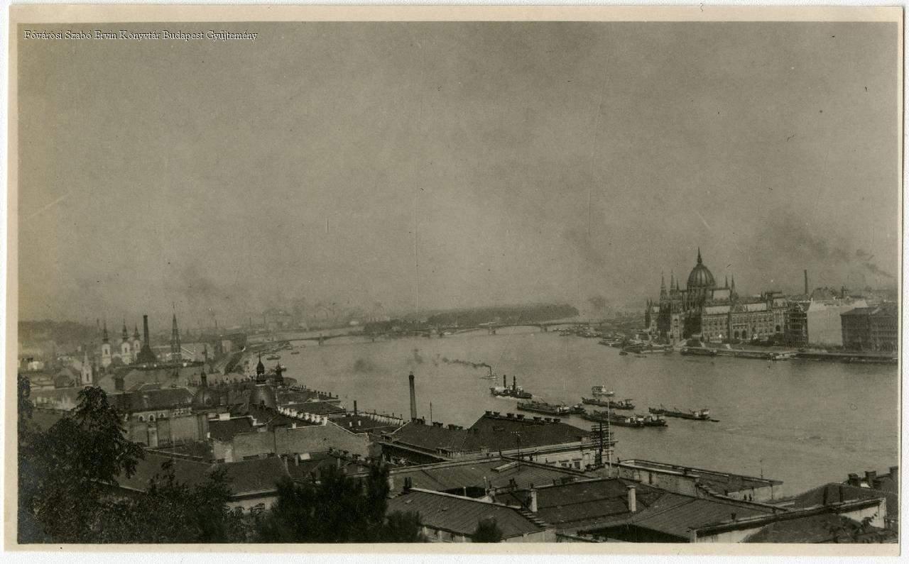 Jobbra az Országház épülete, mellette az épülő Wellisch-bérpalota. A távolban a Margit híd és a Margitsziget. A Dunán uszályok haladnak