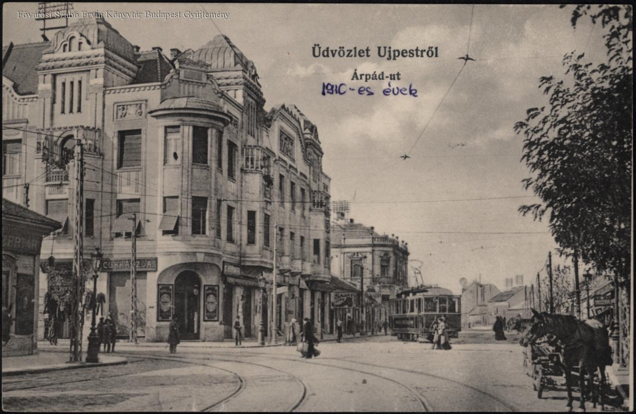 lakóépület, képes levelezőlap, vasúti pálya, villamos kocsi, cukrászda, lovas kocsi, személy, utcakép, 1890-es évek