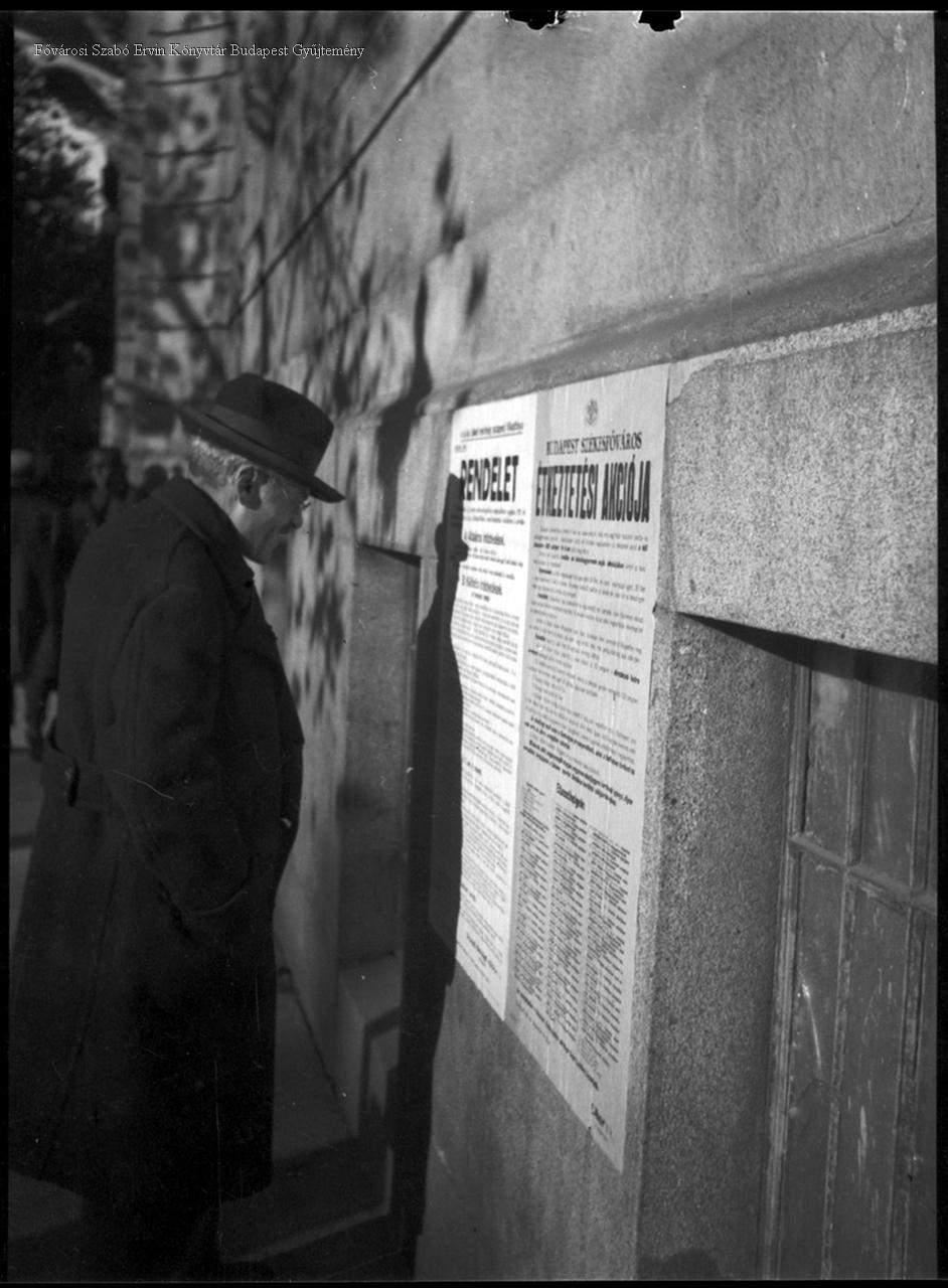 [A főváros étkeztetési akcióját hirdető plakátot olvasó férfi]