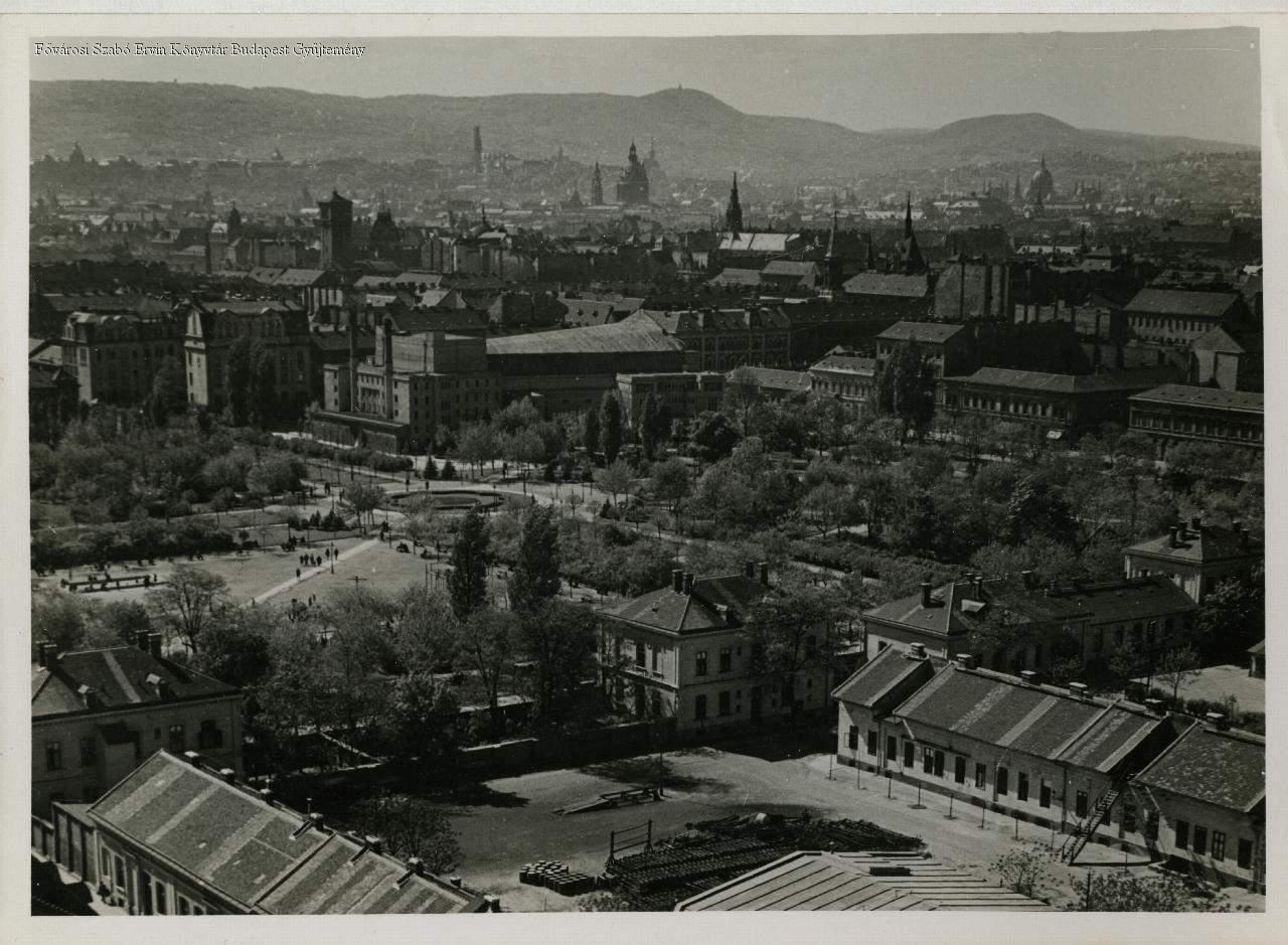 [Kilátás az OTI-székház magasából nyugatra a Tisza Kálmán tér környékétől a budai hegyekig]