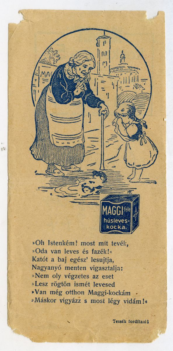 főzés, húsleves, húsleves-kocka, leves, étkezés, táplálkozás, idős, nő, gyermek, ház, vers, reklámvers, reklámnyomtatvány, kisnyomtatvány, aprónyomtatvány, számolócédula