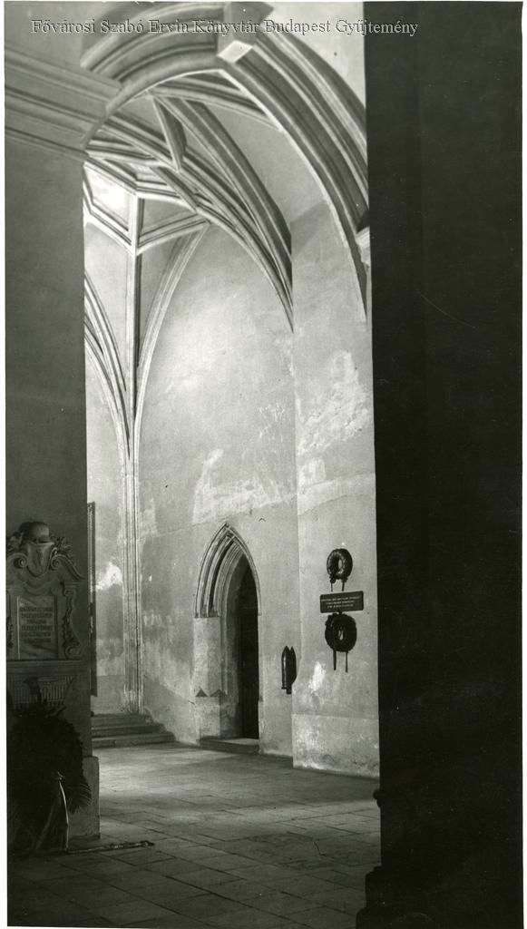 épületkép, templom, katolikus egyház, előcsarnok, gótika, boltozat, emléktábla, 1930-as évek