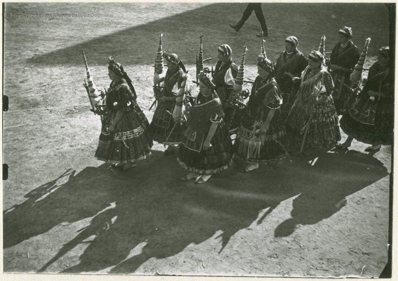 [Népviseletbe öltözött asszonyok, kezükben guzsaly]