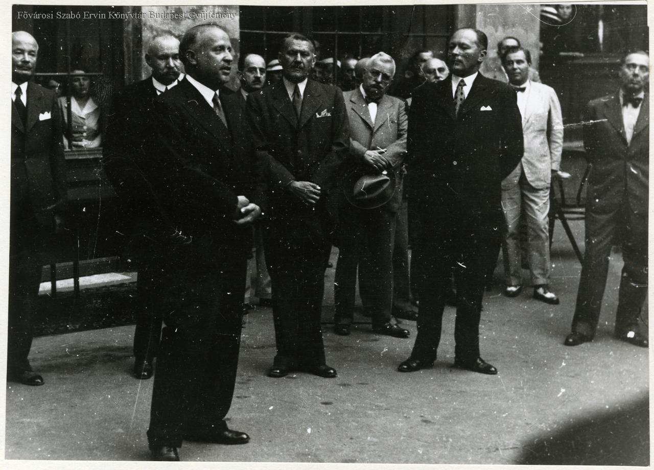 [A főváros vezetői üdvözlik a Gyöngyösbokréta képviselőit a Városháza udvarán] Szendy Károly polgármester beszél