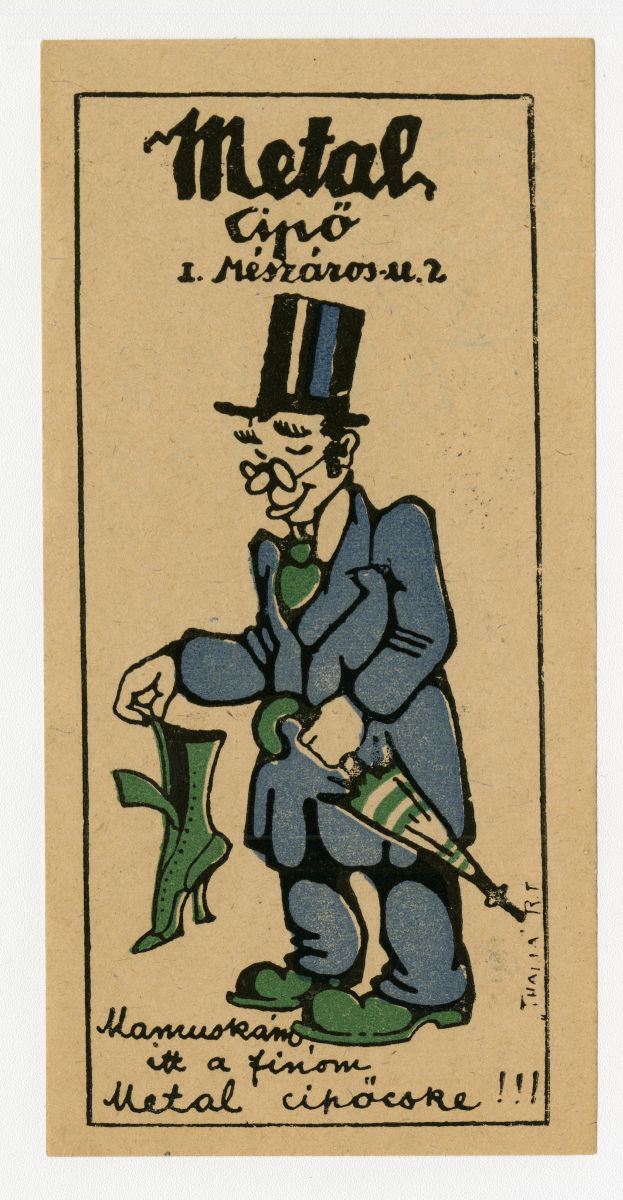 cipő, cipész, férfi, esernyő, cilinder, szemüveg, reklámnyomtatvány, kisnyomtatvány, aprónyomtatvány, számolócédula